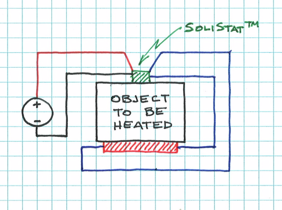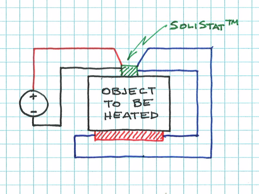 Figure 3 is a mechanical representation of a minimal heating system, but here, we have replaced the bi-metal thermostat with a SoliStat, and the A.C. voltage source has been replaced with a D.C. voltage source. Note that the SoliStat’s red wire connects to the source’s positive terminal and the SoliStat’s black wire connects to the source’s negative terminal. The two white wires (represented in blue on Figure 3) connect to the heater.